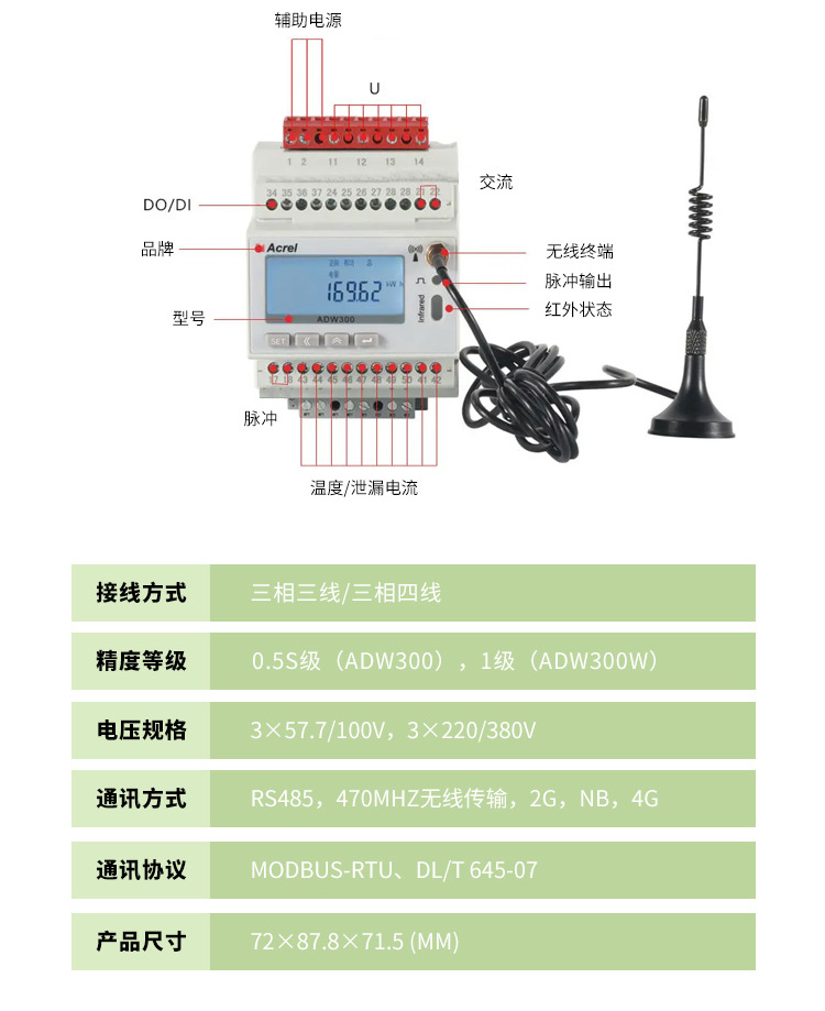 ADW300方便用戶進行用電監(jiān)測、集抄和管理,可靈活安裝在配電箱中,可用于電力運維、環(huán)保監(jiān)管等在線監(jiān)測類平臺中。訂貨范例: