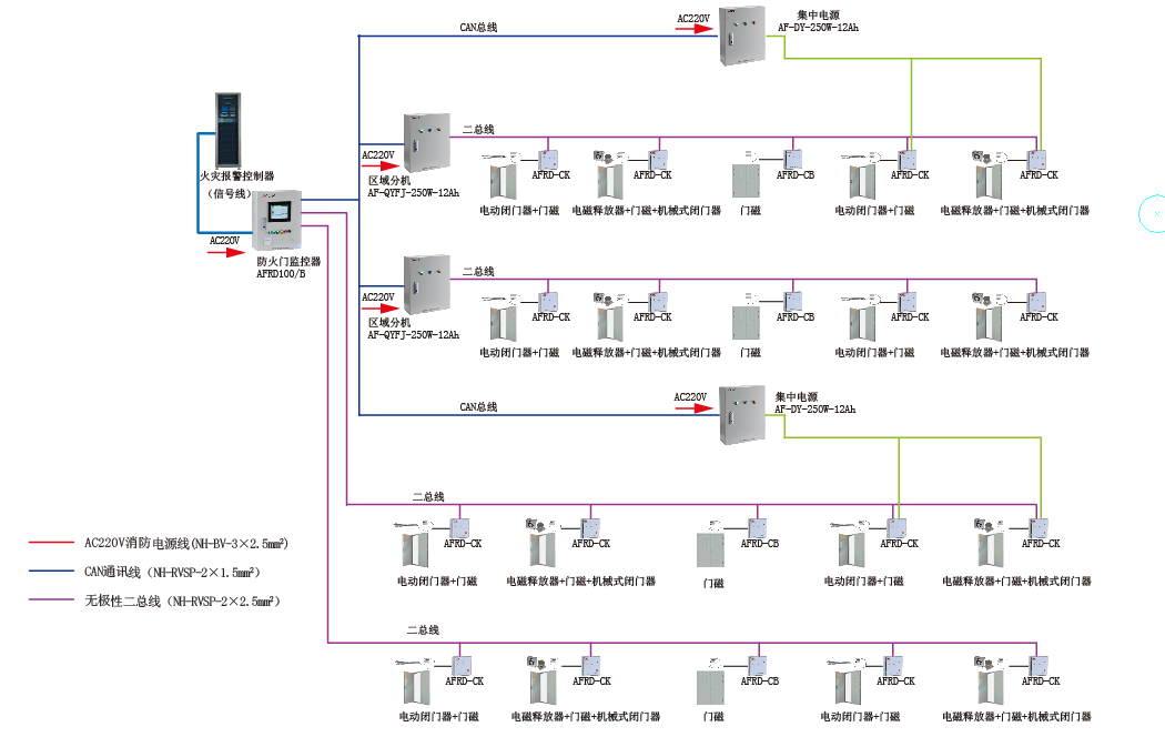 AFRD防火門監(jiān)控系統(tǒng)集中控制其各終端設備即電動閉門器、電磁釋放器的工作狀態(tài),實時監(jiān)測疏散通道防火門的開啟、關閉及故障狀態(tài),顯示終端設備開路、短路等故障信號。系統(tǒng)采用消防二總線將具有通信功能的監(jiān)控模塊相互連接起來,當終端設備發(fā)生短路、斷路等故障時,防火門監(jiān)控器能發(fā)出報警信號,能指示報警部位并保存報警信息,保障了電氣安全的可靠性。